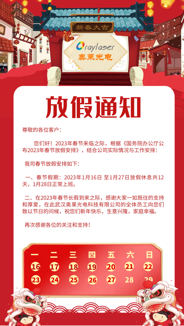 二、在2023年春節長假到來之際,感謝大家一如既往的支持和厚愛,在此武漢奧萊光電科技有限公司的全體員工向您們致以節日的問候,祝您們新年快樂,生意興隆,家庭幸福。